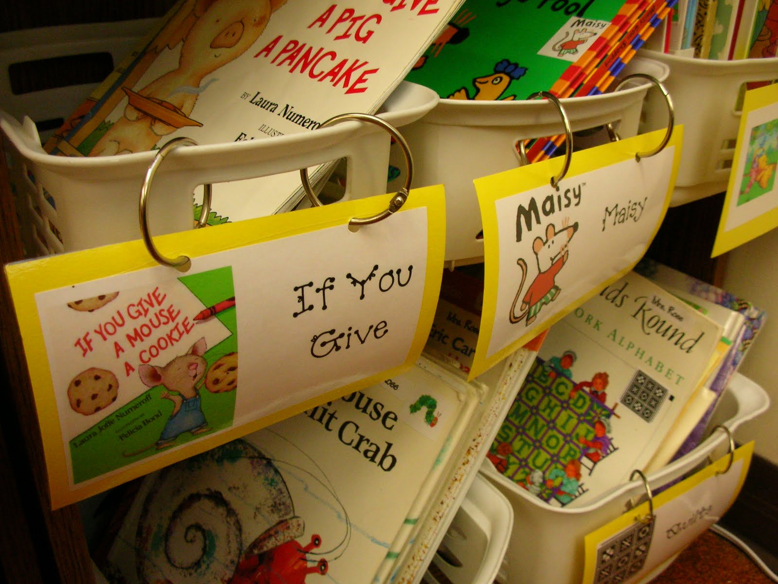 Bins are essential for organizing books in my classroom.