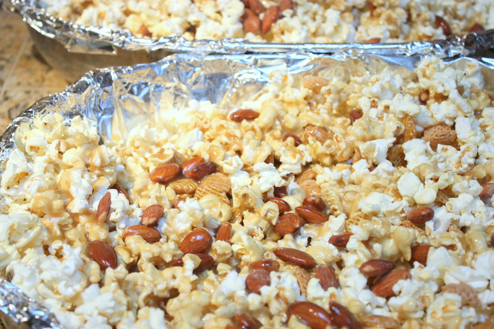 Pour the sticky deliciousness from the pan, all over the popcorn/crispix mixture and stir it up.