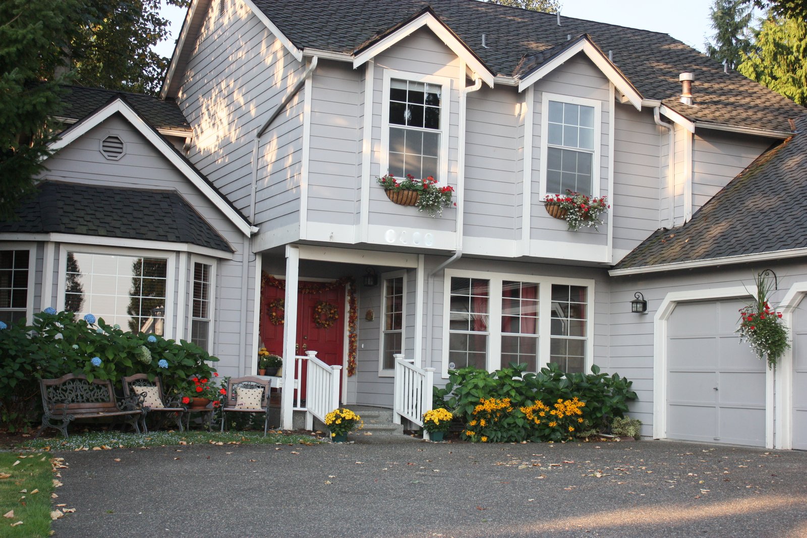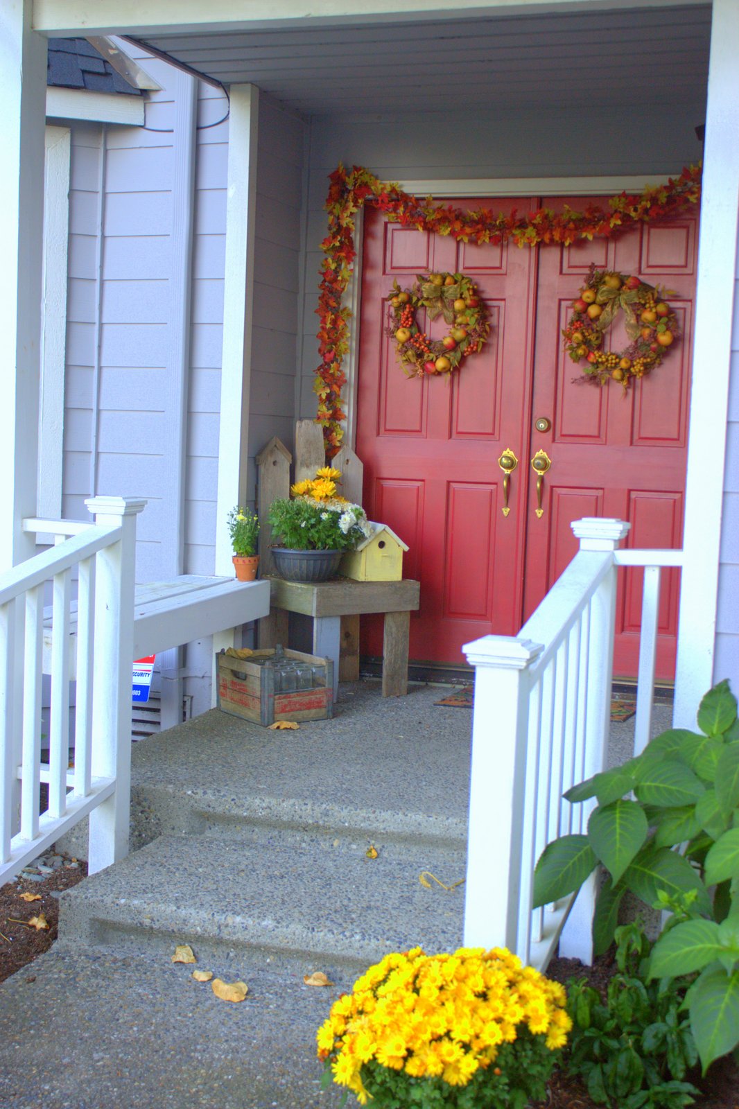 My hanging baskets are still all about summer, but I’ll be changing out a few plants to yellow or orange mums as the petunias start to die.