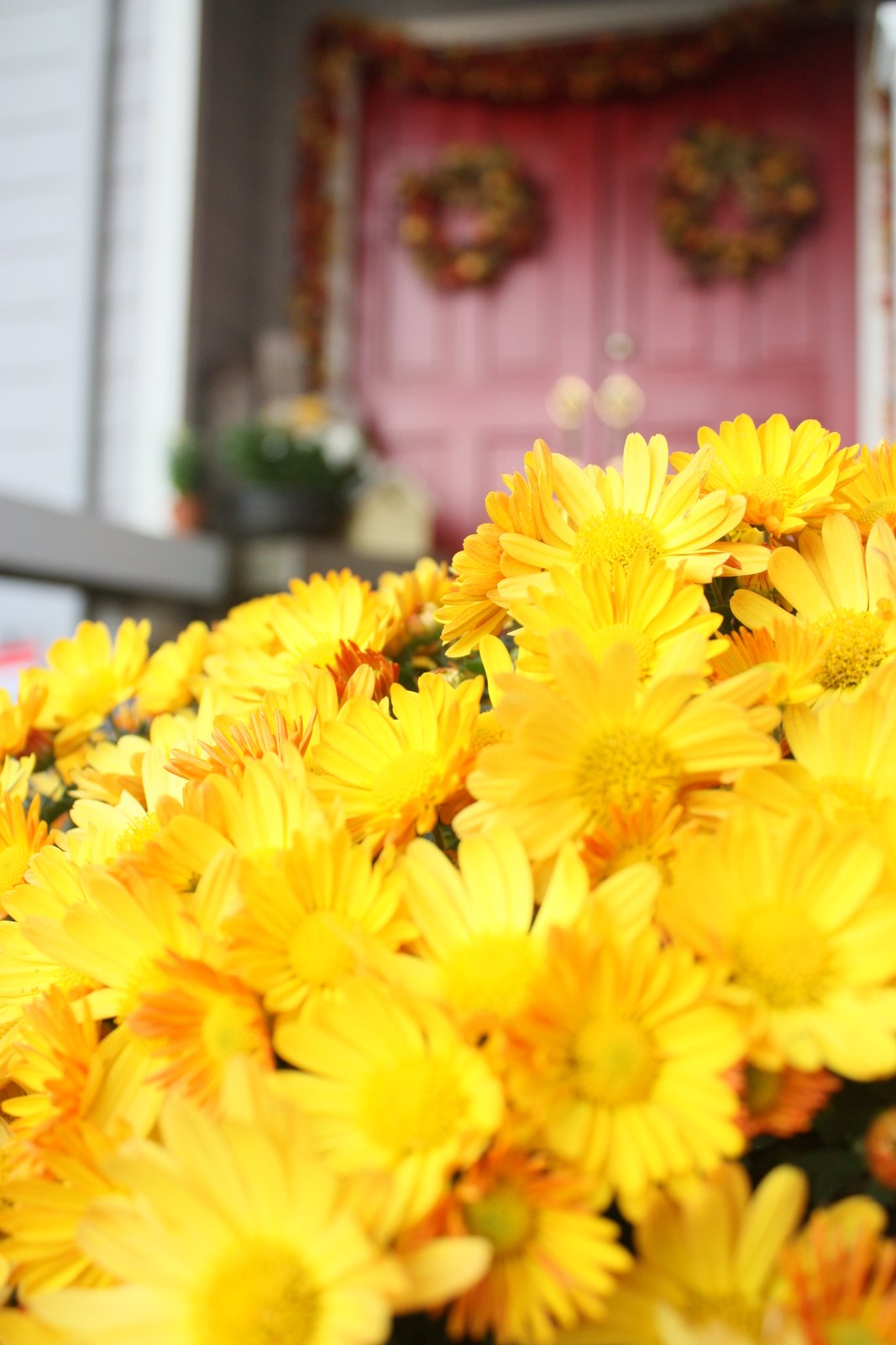 On a lighter note, I needed a little pick-me-up after one of our days at the hospital. I asked my hubby to get my fall boxes down so I could do a little decorating. The front door was my first stop. I’m trying to add a bit more yellow to the front of my house. I love black-eyed-susans and mums, so those were the obvious pick. I wasn’t quite ready to change to my burlap pillows, but summery stripes just didn’t cut it anymore.