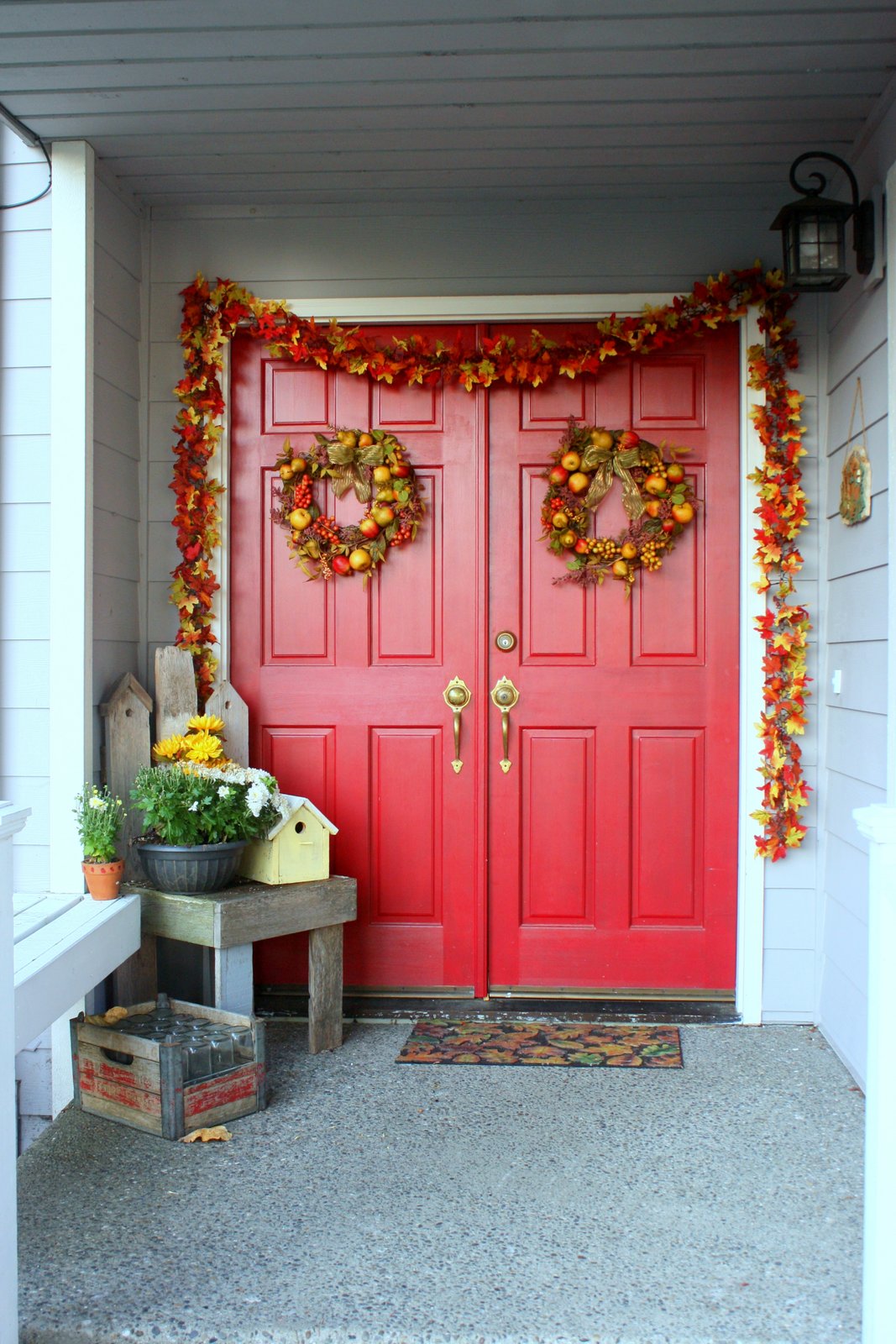 Before I tell you about my front porch fall-ification, I’d like to say thank you for all of your nice comments and emails about my grandma. She has had a very difficult few days. My mom slept on her couch, sitting up, fully dressed, because she was sure the hospital would call in the middle of the night and she wanted to be ready to go. Today, we packed up Nanie’s room in Assisted Living. In the best case scenario, she would go back to Nursing, but we know she is well past that. We were happily surprised today when we visited. She was the most alert we’ve seen her in a week. It was nice to see her try to eat and be able to speak a few words. Thank you so much for your kind words. It really makes a difference.