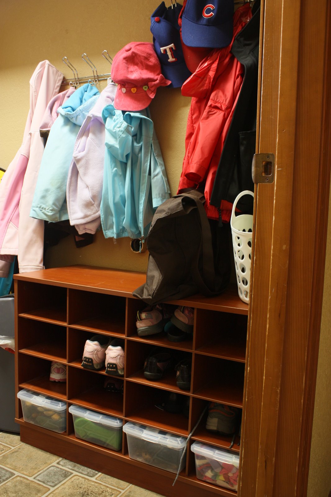 The coat room is also the place for library books. The brown bag is filled with books ready to go back to the public library. The white bin stays there. It’s for library books we are still reading or haven’t started reading yet. Let me just tell you how devastating it is for a five year old when all of their classmates get to check out library books, but they can’t because they couldn’t find their book before school. Keeping the books in one central place helps kids have less chaos as they are heading out the door for school.