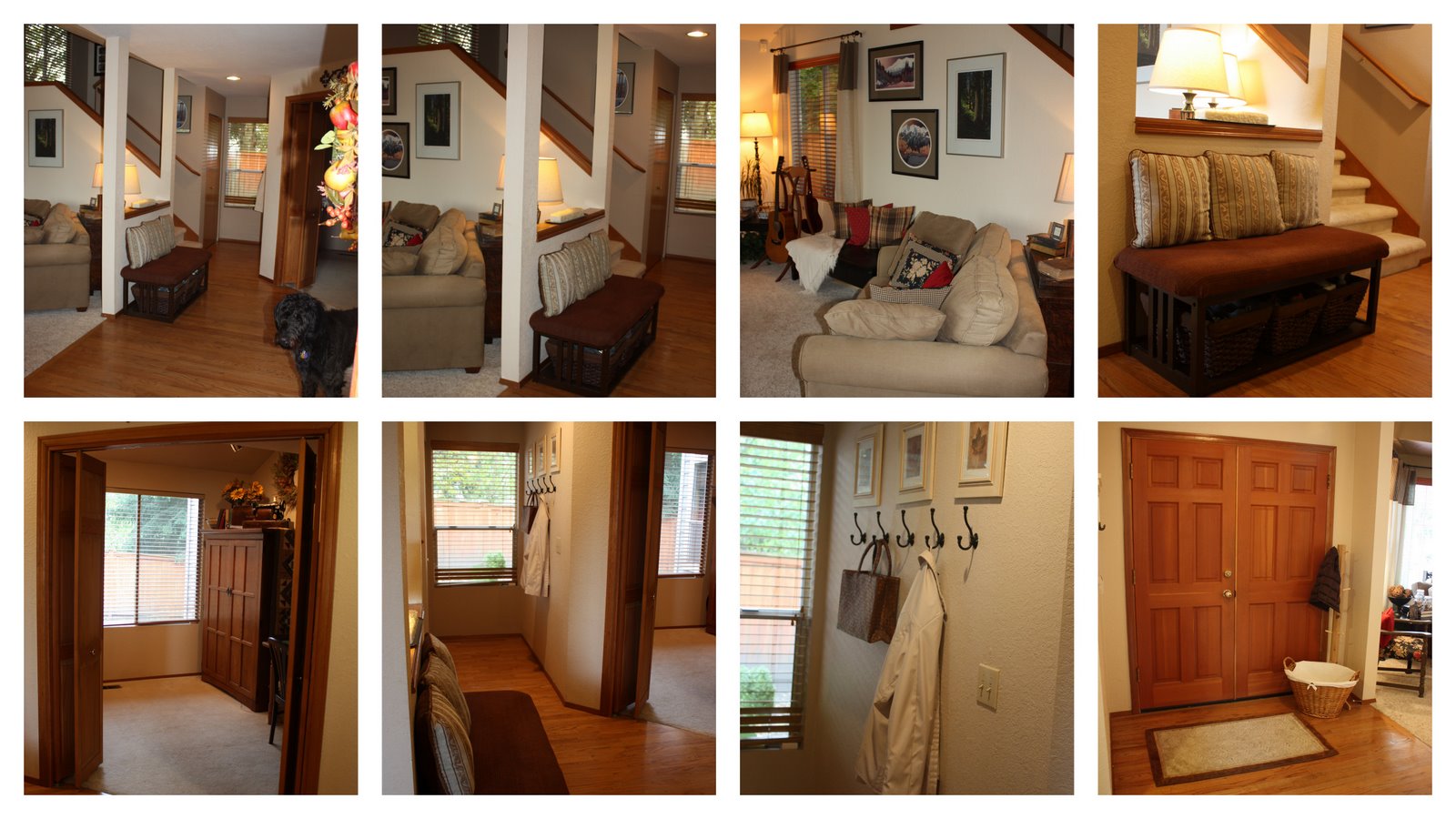 Actually, I was impressed by it. I liked how tidy and neat it was because stuff is always out in our house. Perhaps a slightly warmer shade on the walls or even just those columns and half wall behind the bench. Maybe even just painting the ceiling in the entry only and adding a different light fixture. It may be the angle of the picture but the entry ceiling is the first thing I noticed. Window treatments might help too but I would keep them simple. If I walked into your house and smelled cookies (and saw that cute dog), I would feel welcomed just by that.