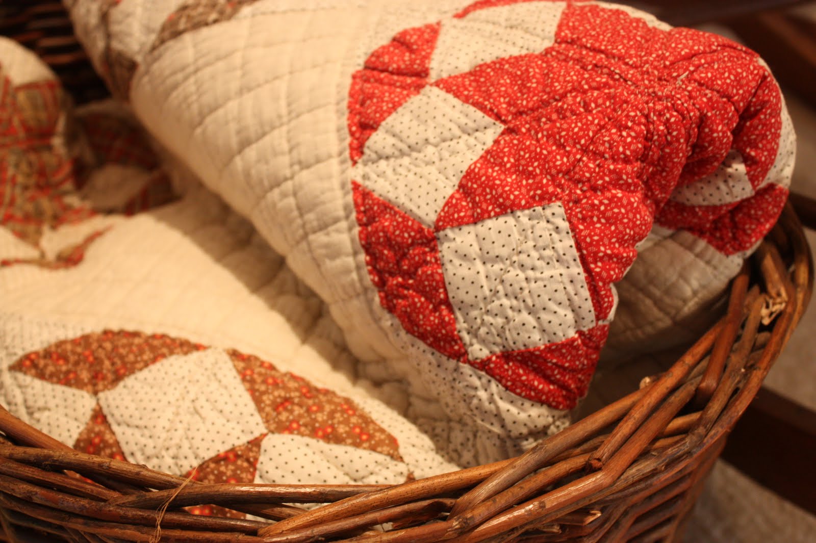 The flower garden quilt is from my husband’s side of the family. It is very tattered, but I just have the good part of the quilt poking out of the basket. The star quilt was made my great grandmother.