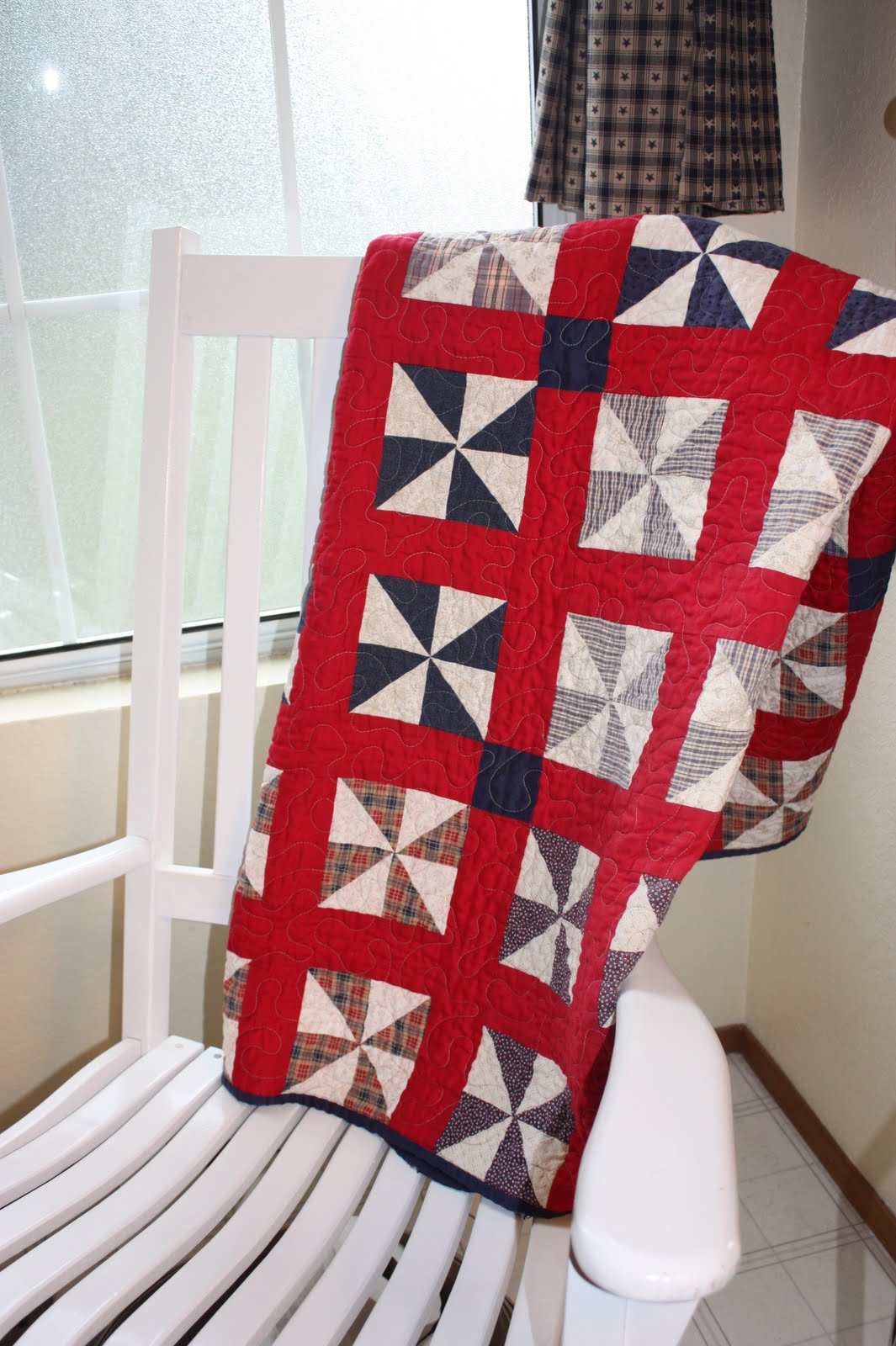 The red pinwheel quilt is on the rocking chair, in the kids’ bathroom.
