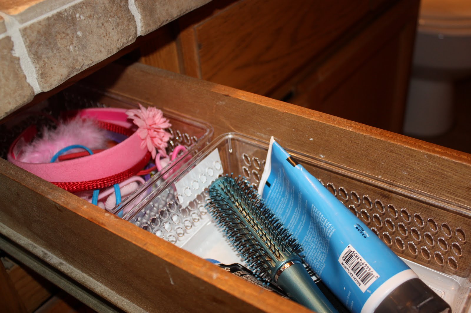 I used little plastic bins to contain the toothbrushes, toothpaste, combs, and headbands. Then a perfect plastic container to hold hair bows and clips. The summer weather hasn’t really started here yet, so I’ll keep working on my indoor projects until pool weather starts!