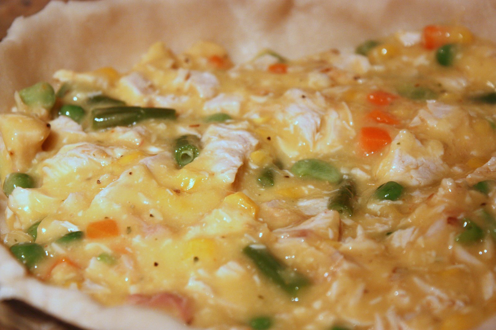 Thank you for the recipe. I first sauted some onion and celery then added the mixed veggies so they were heated up that way. I used leftover Turkey. I added the cream of chicken but it was not enough so I also added a can of cream of potato and a bit of milk cause the potato soup was very thick, bout 1/2 a can. Perhaps my pie pan (9") was bigger. My family loved it and gobbled it up.