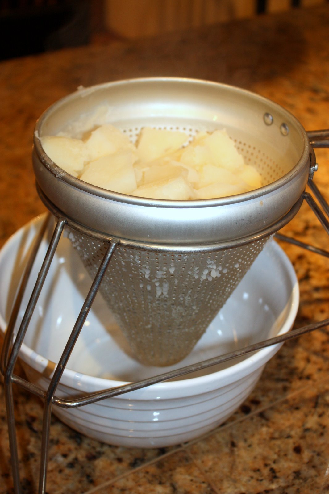 When I got home, I boiled my potatoes just until soft. The food press is made for easy draining. After draining all of the water into the sink, I started pressing the potatoes.
