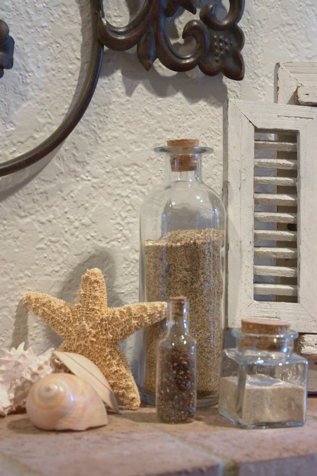 On my way home from Hobby Lobby, I stopped by my favorite store, Goodwill. I found this shadow box. It was meant to be! I had the little bottles and a box full of shells waiting to fill this perfect little shadow box. My kids filled it up and we hung it in the family room.